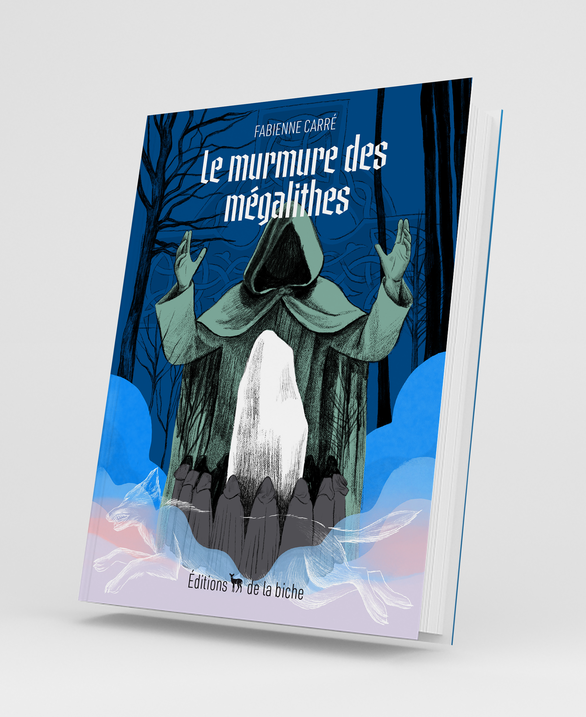 Illustration et mise en page de la couverture du livre Le murmure des mégalithes — Maison d'édition : Editions de la biche Autrice : Fabienne Carré